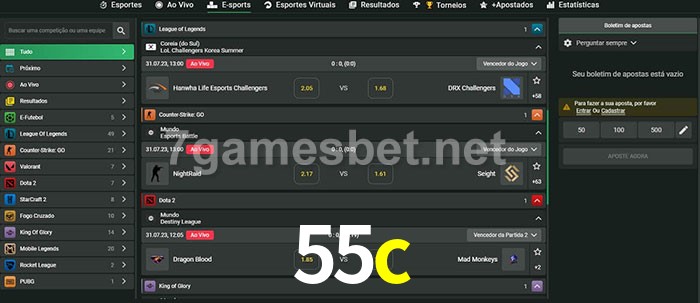 O 55c oferece uma grande seleção de opções de apostas em e-sports com probabilidades competitivas